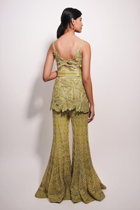 Arctic lime green spaghetti kurta featuring all over floral cutwork embroidery. Paired with an embellished belt and aztec embroidered sharara.