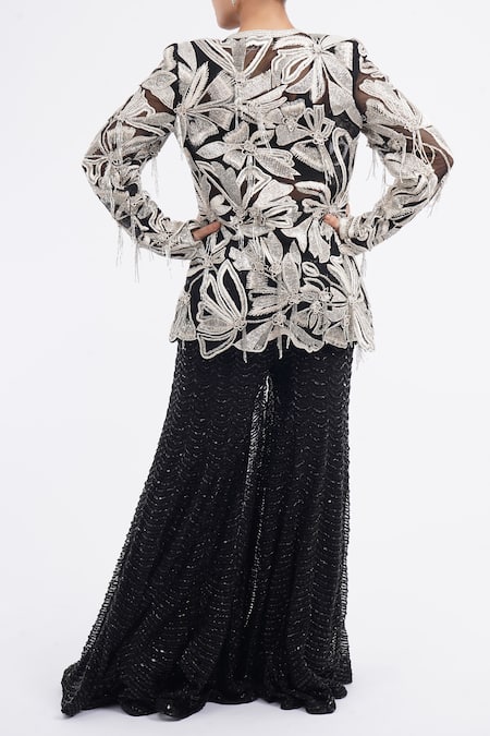Black jacket featuring contrasting floral and tassel embroidery. Paired with a tonal embroidered sharara and an inner bustier.