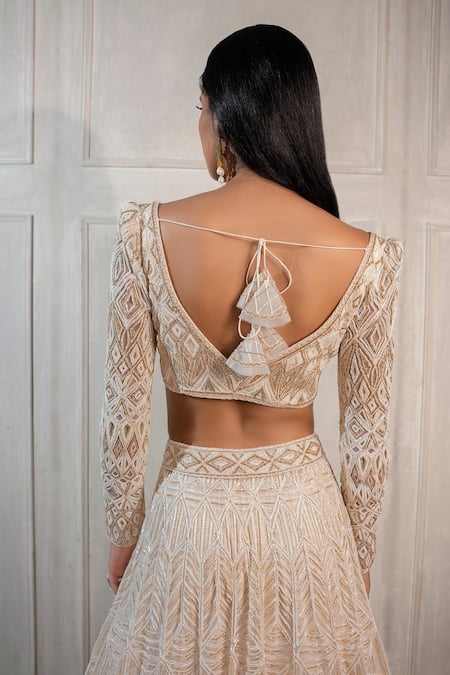 Ivory and gold flared lehenga with hand embroidery in geometric pattern. Comes with matching embroidered blouse & dupatta.