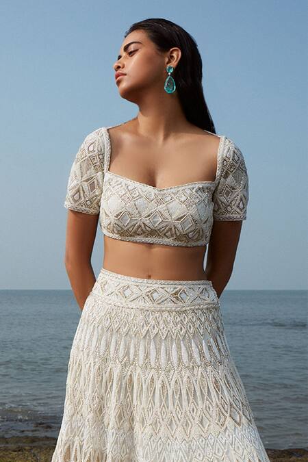 Ivory lehenga with all-over embroidery. Comes with blouse and dupatta.