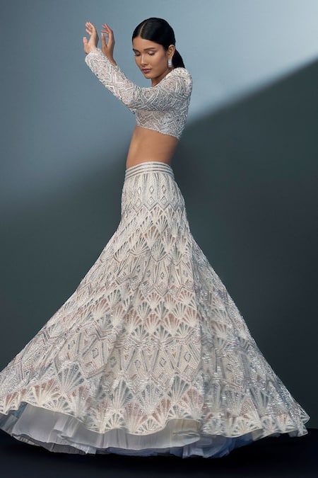 Ivory Crepe Embroidered Crystal V Neck Imperia Lehenga Set