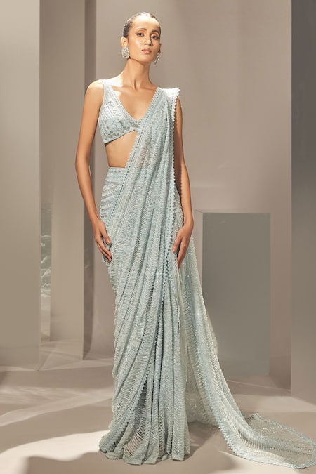 Ice blue lehenga saree featuring scallop embroidery with bead, thread, resham, sequin, and bugle work. Paired with an abstract embroidered padded blouse.