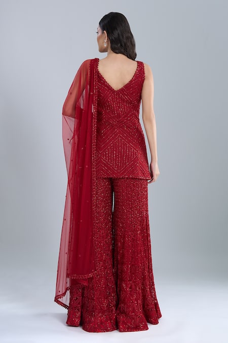 Red Crepe, Georgette, Net Embroidery V-neck Warren Kurta Sharara Set