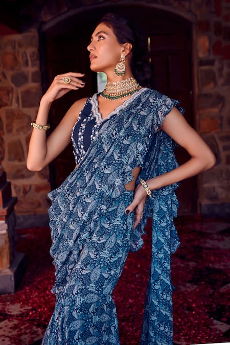 Midnight blue sharara saree featuring a bird print and ruffle hem. Paired with an embroidered blouse showcasing cutdana, floral, and sequin work.