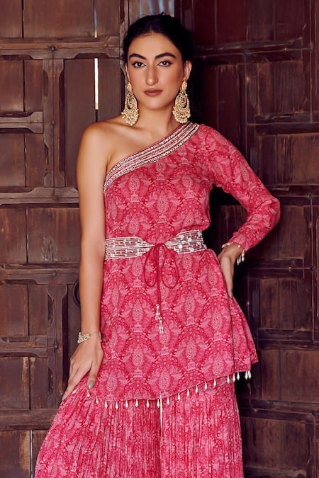 Fuchsia one-shoulder tunic featuring bird print and intricate embroidery. Paired with a matching gharara and embellished boho belt.