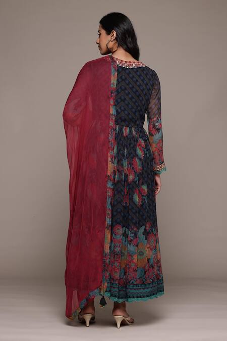 Buy_Ritu Kumar_Black Chiffon, Cotton Embroidery V-neck Floral Kurta Set_Online_at_Aza_Fashions