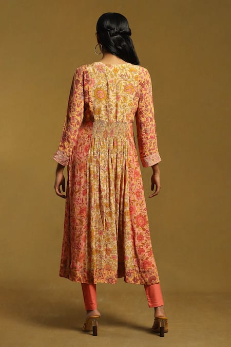 Peach Viscose, Cotton, Lycra Alyssa Floral Print Gathered Kurta Churidar Set