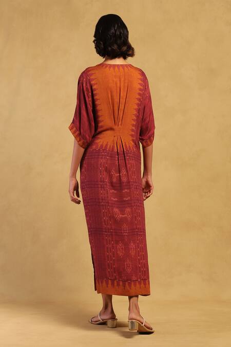Burgundy and red kaftan dress featuring a notched V neckline and kimono sleeves