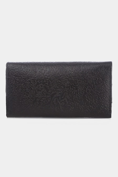 Intricate floral embossed design on the exterior., Gold-tone brand logo plate on the front.