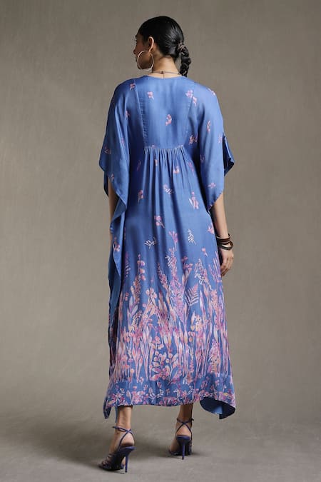 Blue Dehri Satin Floral Motifs V Neck Botanical Print Kaftan Dress