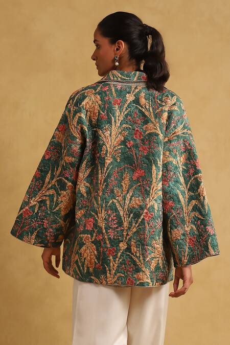 Green Viscose Mandarin Collar Botanical Print Quilted Jacket