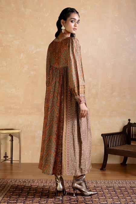 Brown dress featuring a round neckline and long sleeves with intricate embroidery