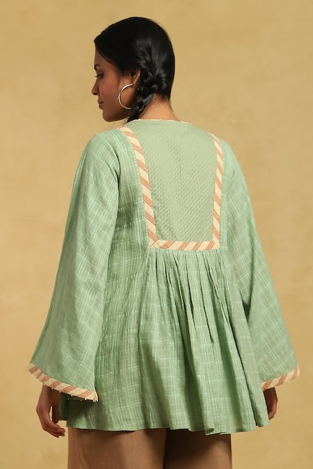 Green Cotton Beads Split V-neck Checkered A-line Kurta With Bell Sleeves