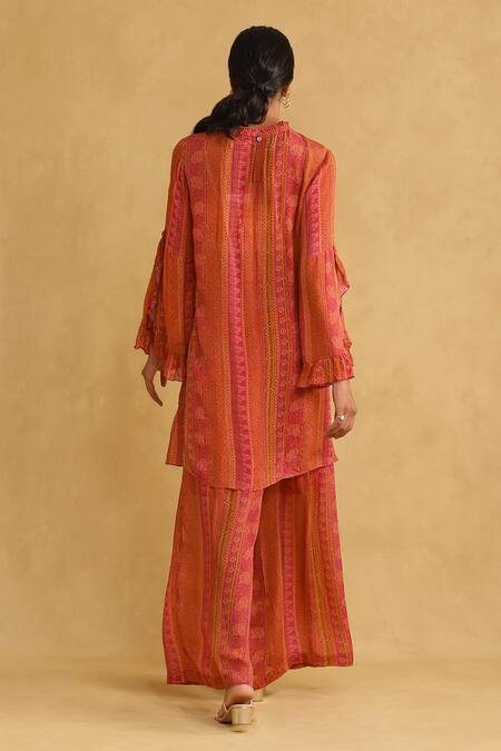 Pink & orange striped colorblock kurta featuring all-over floral prints and frill hem sleeves. Paired with matching printed palazzo for a coordinated look.