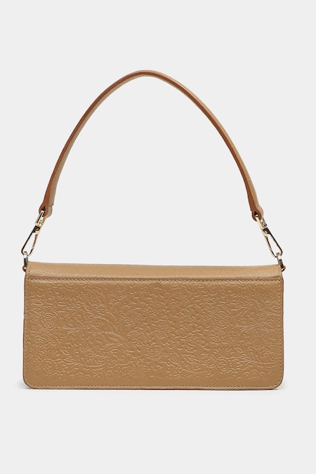 Embossed floral pattern on leather surface, Magnetic closure for easy access, Gold-tone hardware with brand logo