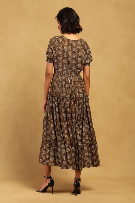 Green Viscose Round Neck Dhriti Printed Tiered Dress