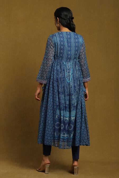 Blue anarkali featuring an embroidered yoke and side tie-up detailing. Paired with leggings and a dupatta, it showcases a motif print border with tassels.