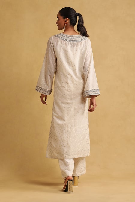 Off White Cotton, Silk, Organza Embroidery, Tassels Split Kurta Palazzo Set