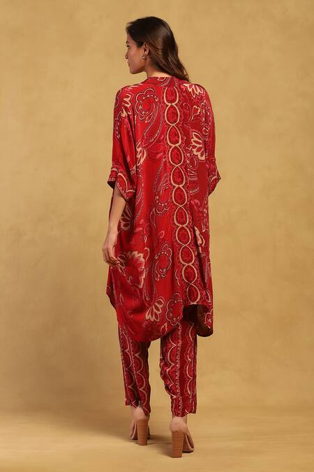 Red three fourth sleeves C cut tunic featuring an all-over floral print. Paired with coordinating pants that complement the tunic's design.