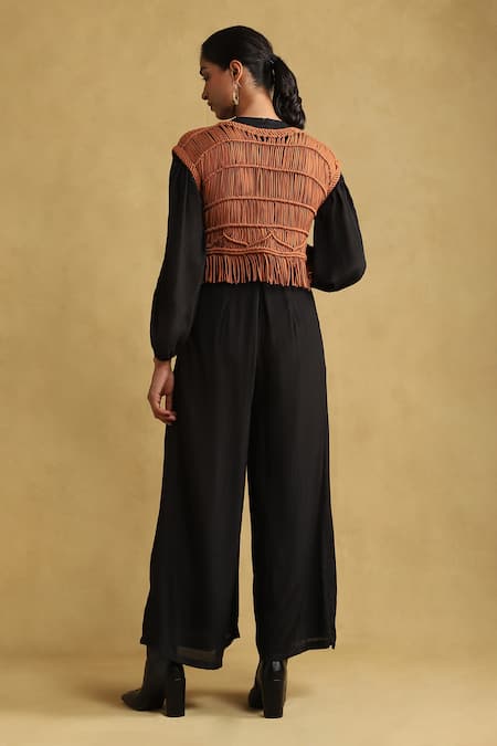 Black flared jumpsuit crafted from 100% silk featuring a band collar and balloon sleeves. Paired with a sleeveless macrame top with fringe detailing.