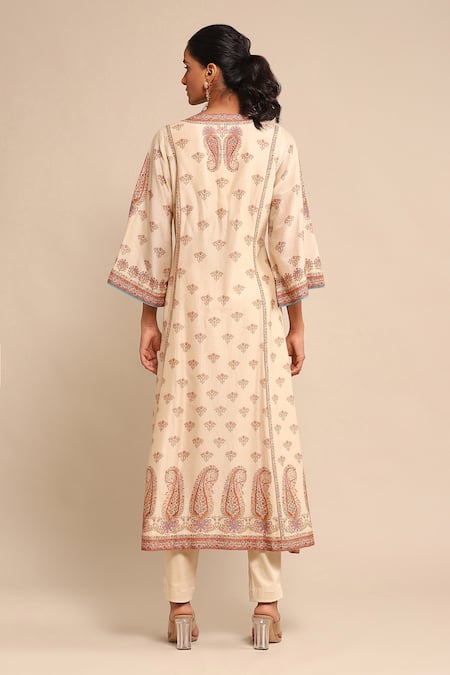 Off white A-line kurta featuring floral motif prints and a notched neckline. Paired with cotton satin lycra pants and a printed cotton silk dupatta.