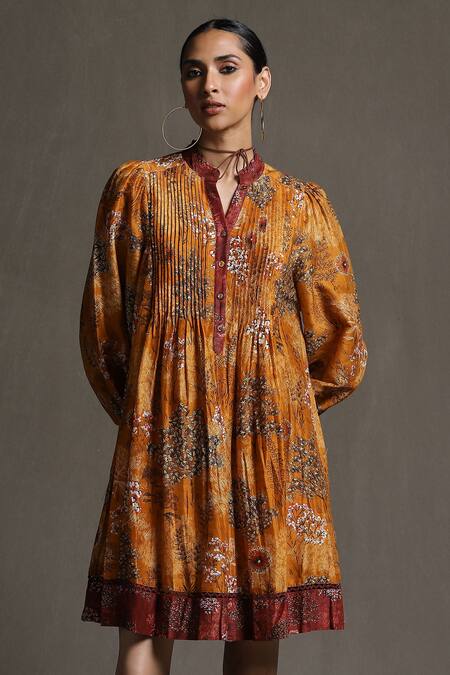 Mustard short dress with floral prints, pintuck details & band collar.