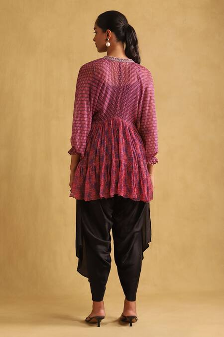 Purple Viscose Embroidery Open Neck Floral Print Gathered Tunic