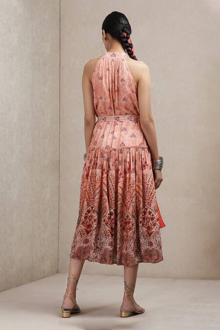 Buy_Ritu Kumar_Peach Viscose Bamberg Halter Floral Print Dress_Online_at_Aza_Fashions