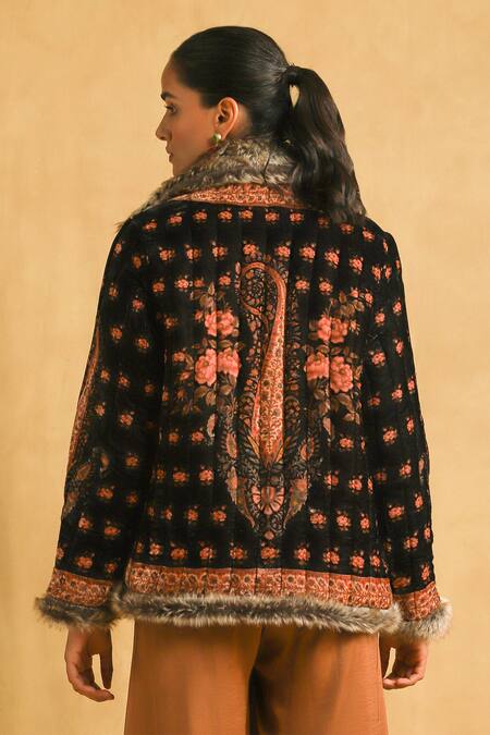 Black Silk, Velvet Embroidery Collared Floral Print Quilted Jacket