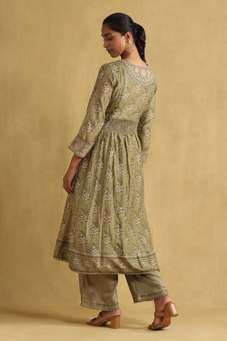 Green Viscose, Rayon, Cotton Embroidery, Floral Print Smocked Kurta Palazzo Set