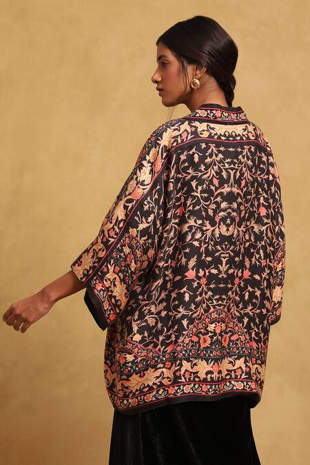 Black Cotton, Modal, Wool Open Neck Floral Vine Print Shrug