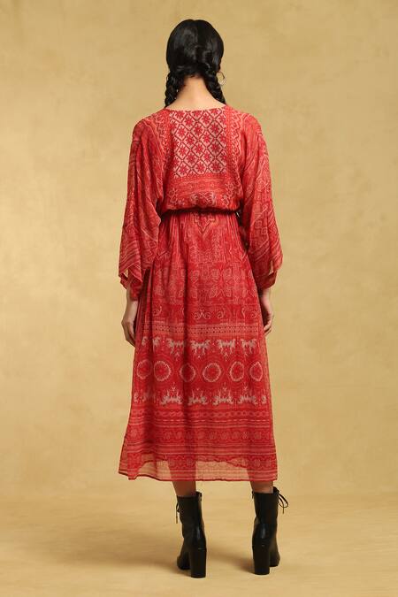 Red dress featuring a floral print, flared sleeves, and a V neck