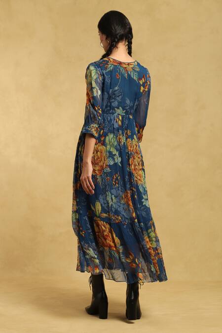 Blue midi dress featuring a floral print with a V neck and cuff sleeves