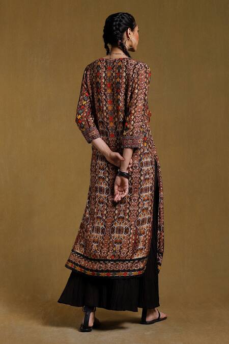 Black kurta with geometric print & notched neck. Paired with flared pant & tassel dupatta.