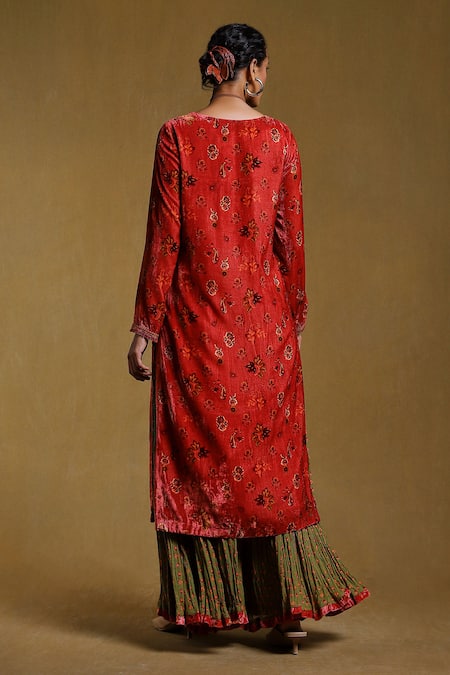 Pink kurta featuring paisley and Godavari print with a zari embroidered placket and cuffs. Paired with a floral motif printed sharara and a dual shaded flower motif dupatta.