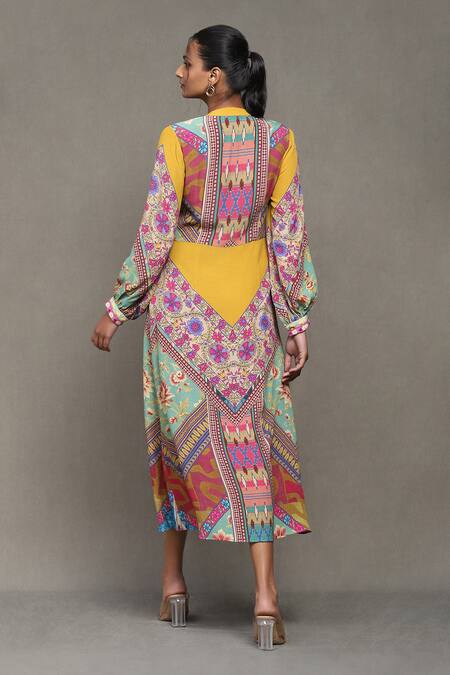 Multicolor A-line dress featuring floral and geometric prints with a band collared neckline and full sleeves