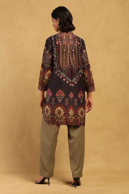 Black cotton voile asymmetric kurta featuring an abstract pattern and pleat details in viscose crepe base