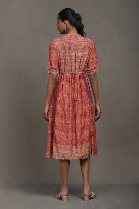 Red Cotton, Silk Mandarin Collar, V-neck Mrinal Geometric Print Dress
