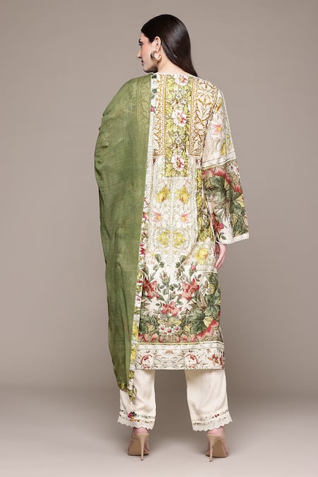 Off white kurta featuring a digital floral print with full sleeves and a round neck. Paired with straight leg pants and a coordinating dupatta.