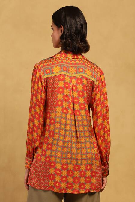 Red shirt featuring all-over abstract phulkari prints and a collared neck