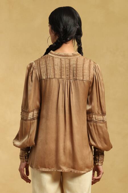 Brown short kurta featuring lace embroidery, balloon sleeves, and a mandarin collar