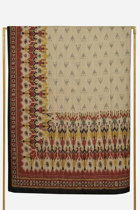 Beige rectangle-shape double bed quilt with geometric print motifs and red border.