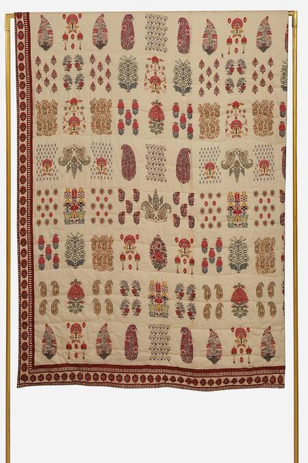 Ivory rectangle-shape double bed quilt with red placement printed motifs and striped border.