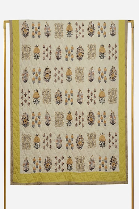 Yellow Print Kashmiri Booti Single Bed Quilt
