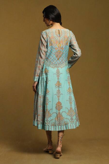 Blue Cotton, Silk Round Neck Printed Tiered Dress