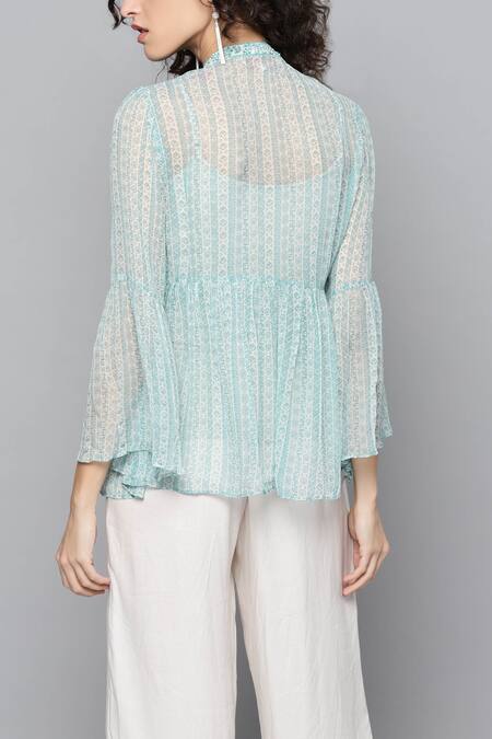 Printed,Embroidered<\n>Split neck with tassel tie up<\n>Front bodice yoke<\n>Bell sleeves<\n>Note: <\n>Pants worn by the model is not for sale