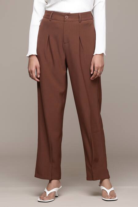 Brown straight leg pant featuring a button and zip closure with belt loops