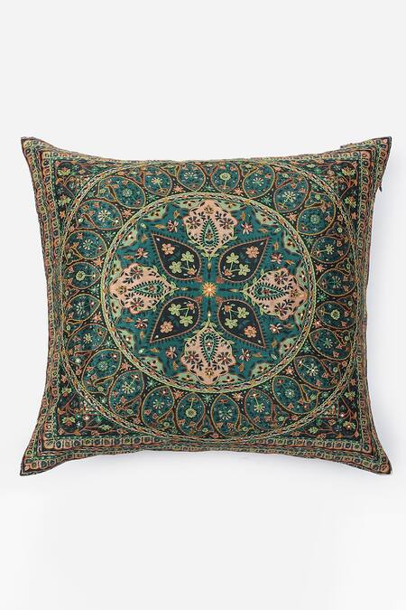 Green square-shaped cushion with embroidered floral motifs and sequin work in front.