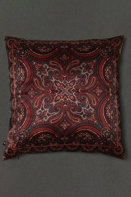 Red square-shaped cushion with embroidered motifs and sequin work in front.