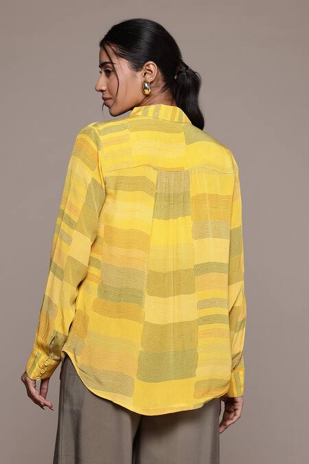 Yellow Viscose Collared Bauhaus Print Loose Fit Shirt